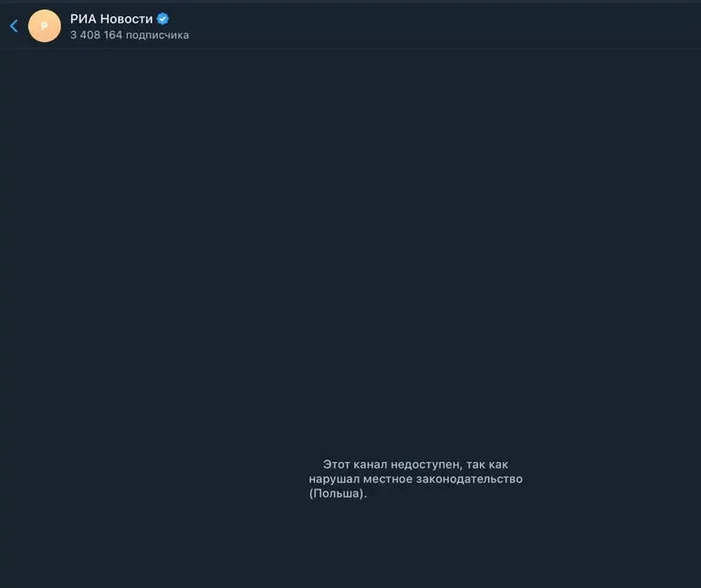 Корреспонденты «РИА Новостей» передают, что их телеграм-канал недоступен в Польше, Бельгии, Франции, Греции, Чехии и Италии.