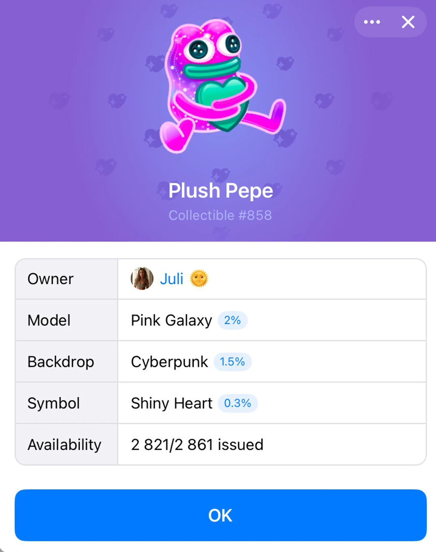 Она собирает подарки в розово-фиолетовых тонах на киберпанковском фоне, так что мне пришлось отдать 15,000 TON (~$52,500) за Плюшевого Пепе»