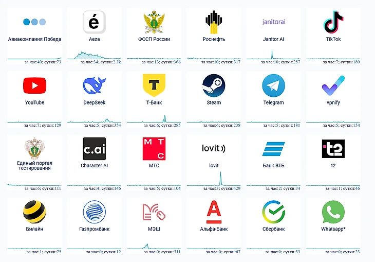 Среди сервисов и приложений утром, 14 октября, массовые сбои наблюдаются в работе Авиакомпании «Победа» и ФССП России.
