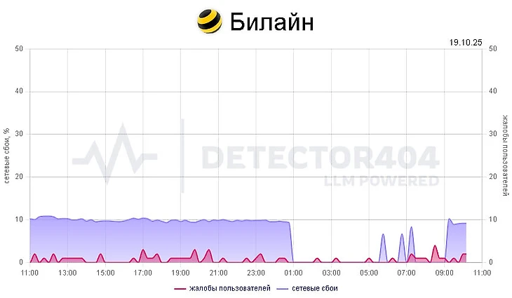 По данным сайтов «Сбой.рф» и Downdetector.su, за последний час поступают сообщения о проблемах в работе Билайна из регионов: