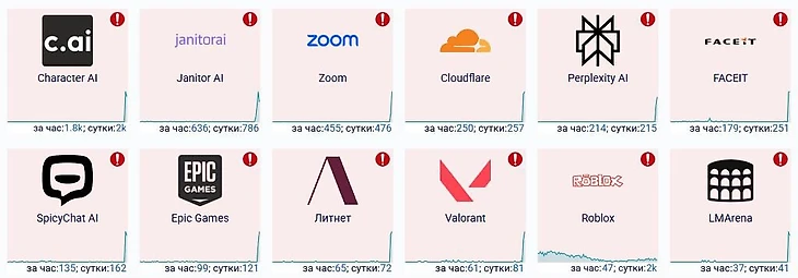 Пользователи жалуются на проблемы с доступом к многим сервисам, включая Character AI, Perplexity AI, Janitor AI, SpicyChat AI, Zoom, Epic Games, Faceit, и Valorant