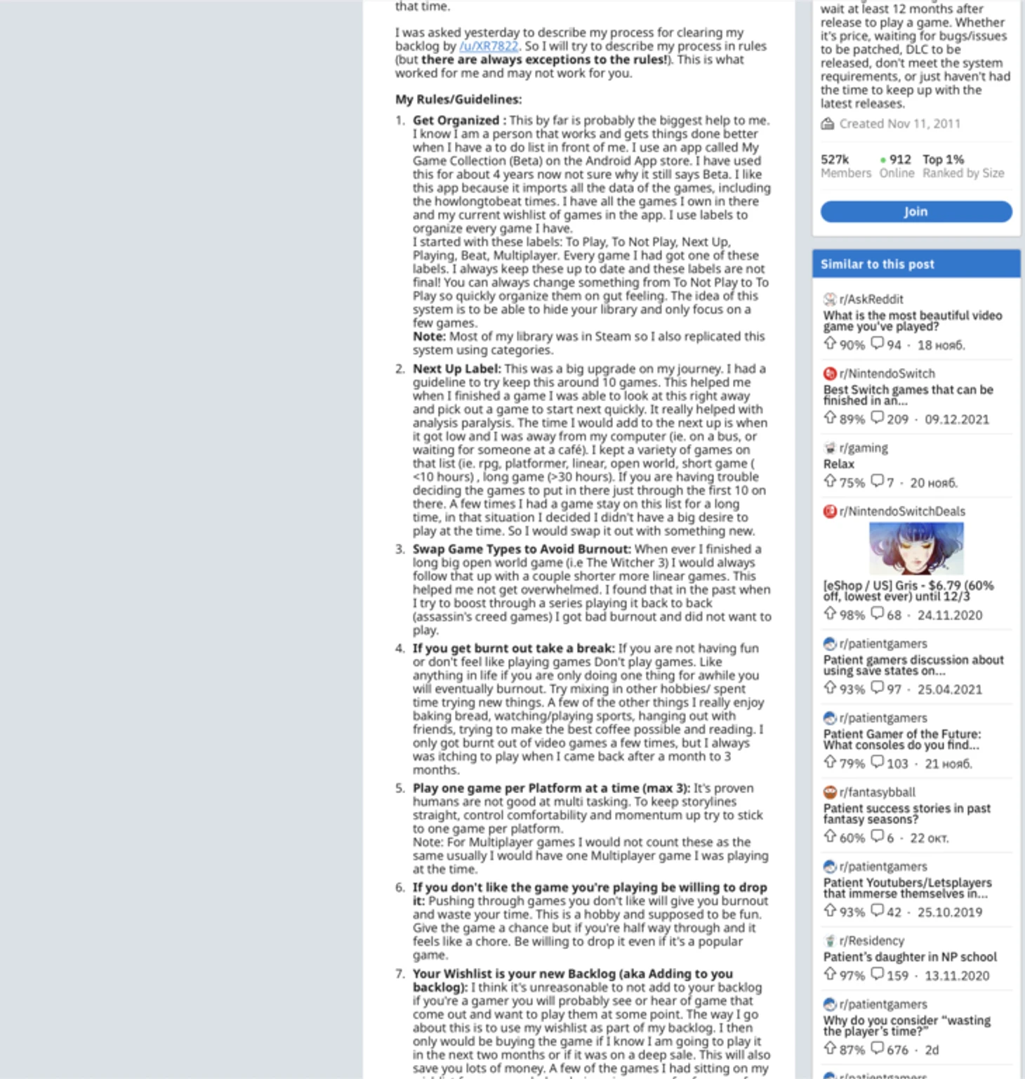 Каждую неделю проводятся бэклоговые обсуждения: кто-то советует пройденные игры, кто-то кидает несколько игр из своего списка и советуется, в какие стоит поиграть скорее, а какие – удалить.