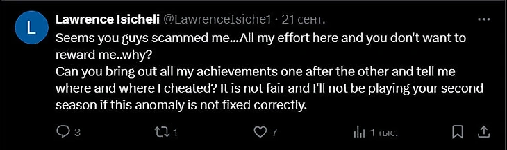 «Вы, ребята, меня обманули. Почему вы не хотите вознаградить меня за все усилия? Вы можете разобрать все мои достижения одно за другим и сказать, где я читерил? Это нечестно, я не буду играть второй сезон, пока вы не исправите все».