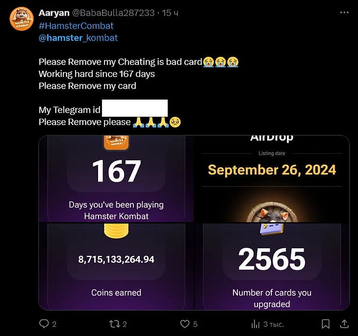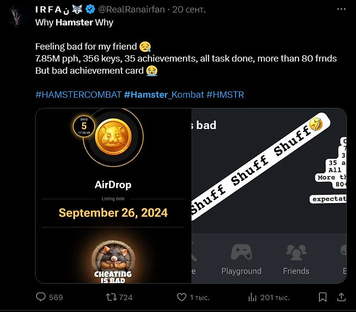 А некоторые игроки не получат ничего – перед дропом забанили массу читеров, среди которых были и честные пользователи. Достижение «Обман – это плохо» обнуляет все усилия за первый сезон. Его можно получить за накрутку рефералок, автокликеры, использование одного и того же WiFi для тапанья с нескольких аккаунтов, подозрительные часы активности (фарм всей семьей по очереди) или за создание разных аккаунтов Hamster Kombat с одного устройства. Игроки уже завалили соцсети жалобами на нечестную блокировку и скам.