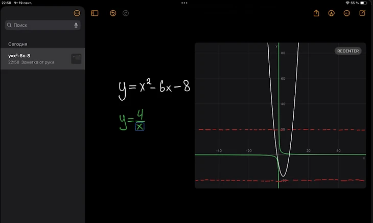 В Заметках есть два варианта изменения числа: вы можете стереть старое значение и ввести новое вручную, либо воспользоваться интерактивным бегунком, который появляется при касании числа. Перемещая бегунок влево или вправо, вы можете точно настроить нужное значение. Любые графики, связанные с изменяемым числом, будут автоматически перестраиваться в режиме реального времени. Это же касается и результатов вычислений, а также графиков, основанных на уравнениях, если вы вносите изменения в значение переменной. Вы всегда можете наблюдать, как корректировки влияют на общую картину расчетов и визуализаций.