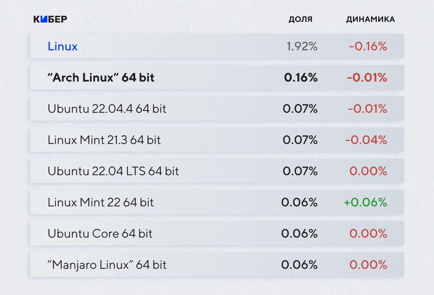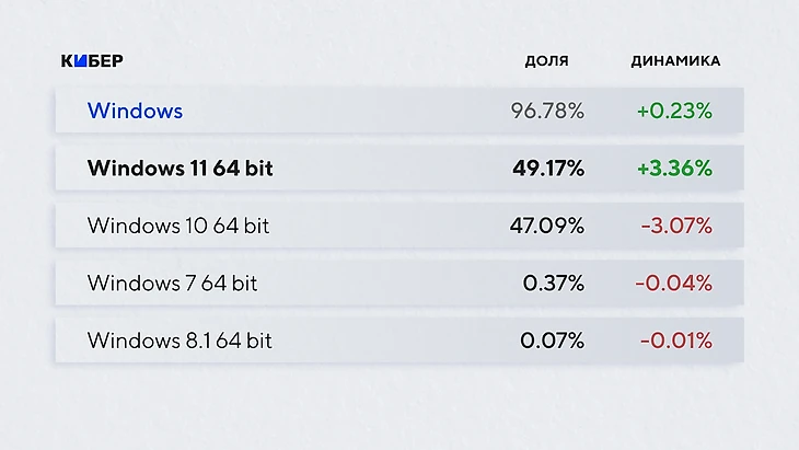 В вопросе ОС все предсказуемо – популярность Windows 11 за последний год возросла на треть и уже обогнала Windows 10. Здесь сыграло несколько факторов: у Windows 11 низкий порог входа при обновлении с десятки, новые готовые ПК и ноутбуки имеют предустановленную ОС, а кого-то могут привлечь уникальные нововведения (в частности, возможности ИИ). И не стоит забывать, что в октябре 2025 года Microsoft завершит поддержку десятки, переключив все внимание на дальнейшее развитие Windows 11 и, возможно, условной Windows 12.
