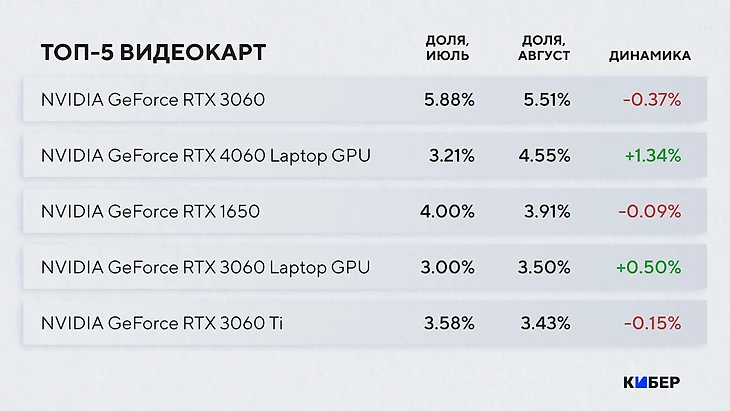 Топ-5 как бы подчеркивает имя народной видеокарты, если кто-то сомневается: RTX 3060, RTX 4060 Laptop, RTX 1650, RTX 3060 Laptop и RTX 3060 Ti.