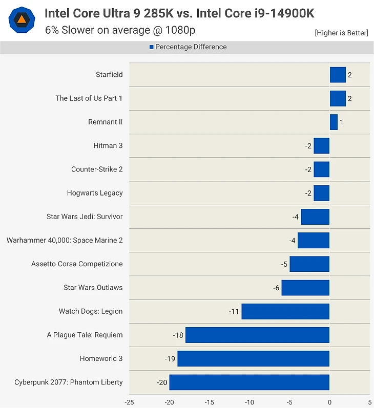 В среднем флагманский Intel 285K оказался на 6% медленнее по сравнению с предшественником Core i9-14900K.
