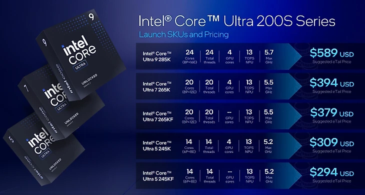 Intel выпустила пять моделей процессоров Core Ultra 200S: Core Ultra 9 285K, Core Ultra 7 265K, Core Ultra 7 265KF, Core Ultra 5 245K и Core Ultra 5 245KF. Модели KF отличаются отсутствием встроенной графики. Это первые настольные процессоры с установленным NPU, нейронным процессором, для ускорения задач искусственного интеллекта. Например, с ним полностью совместим встроенный в Windows 11 ИИ-ассистент Copilot. Но для игр он на данный момент бесполезен. Также это первые процессоры на новом сокете Intel LGA 1851, а это значит, что понадобится новая материнская плата.