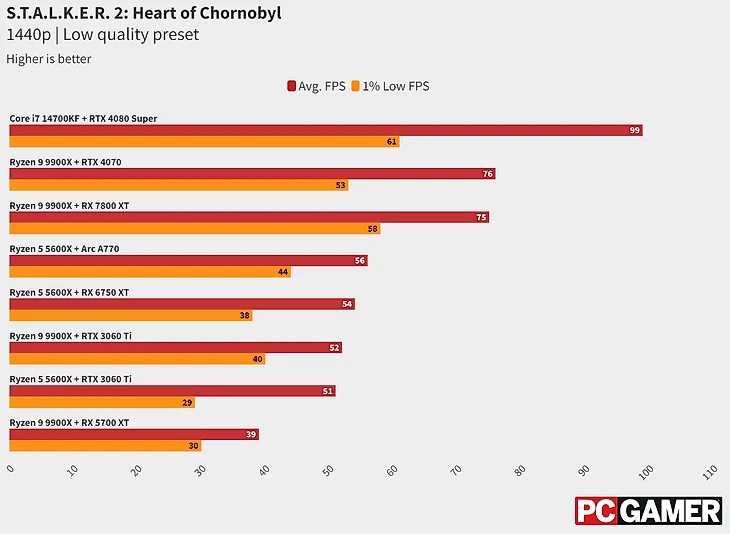 Ник Эвансон, журналист PC Gamer, поделился результатами тестирований S.T.A.L.K.E.R. 2: Heart of Chornobyl на разных компьютерах. Эксперт настоятельно рекомендует использовать апскейлеры DLSS либо FSR, иначе игроки столкнутся с заметными проблемами производительности.