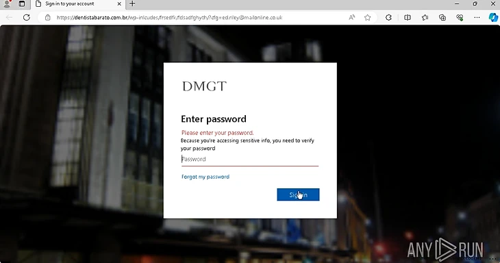 Если пользователь не замечает подвоха и переходит, например, по вложенному QR-коду, он попадает на фишинговый сайт. Тот маскируется под страницу авторизации Microsoft 365 и пытается похитить учетные данные жертвы.