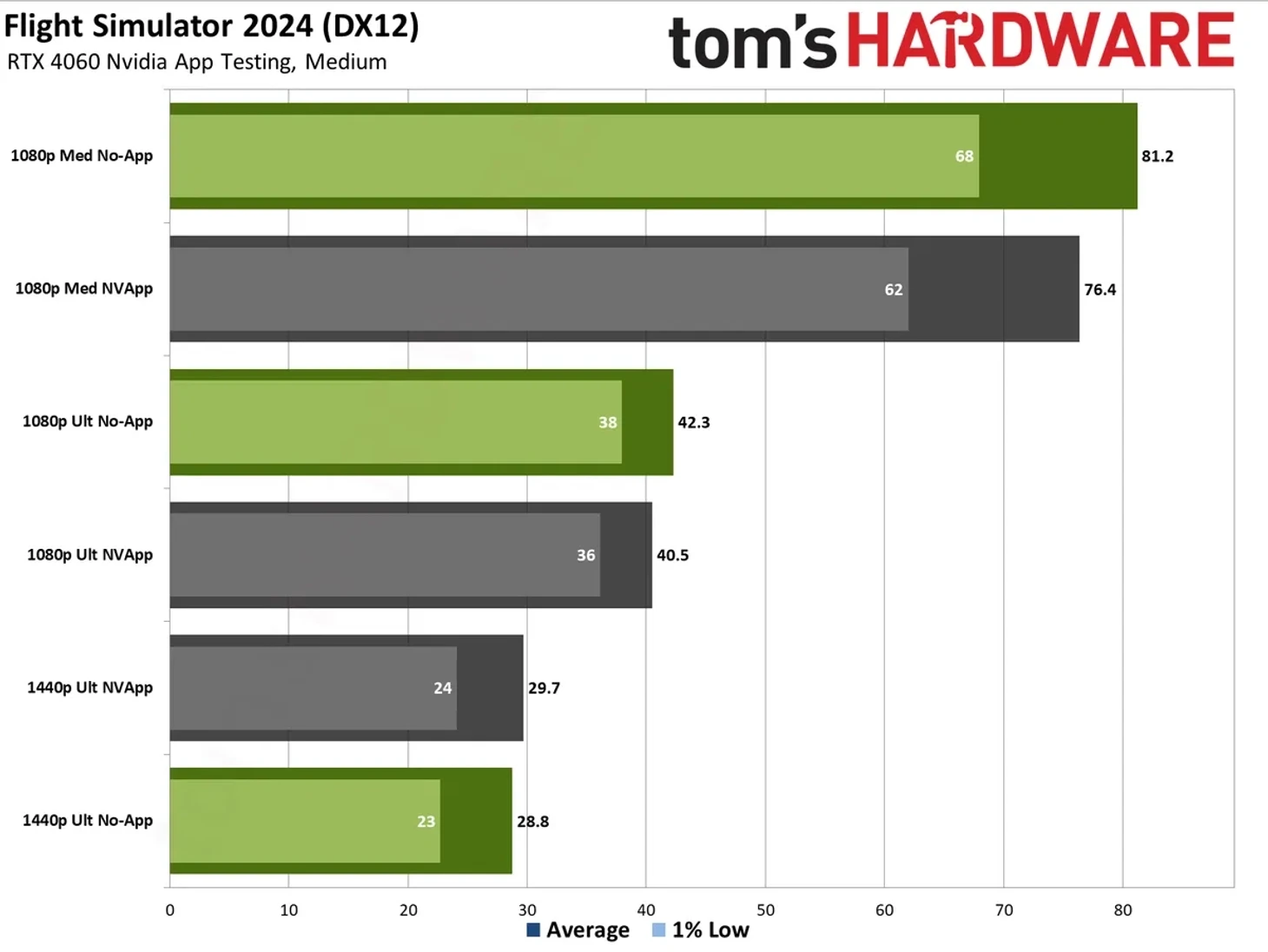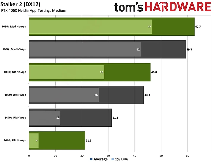 При этом у S.T.A.L.K.E.R. 2 и Microsoft Flight Simulator 2024 случилась аномалия. На «ультра» настройках графики в разрешении 1440p они почему-то показывают больше кадров на ПК с Nvidia App.