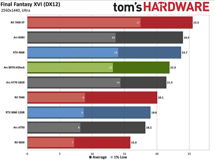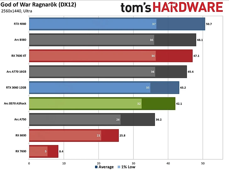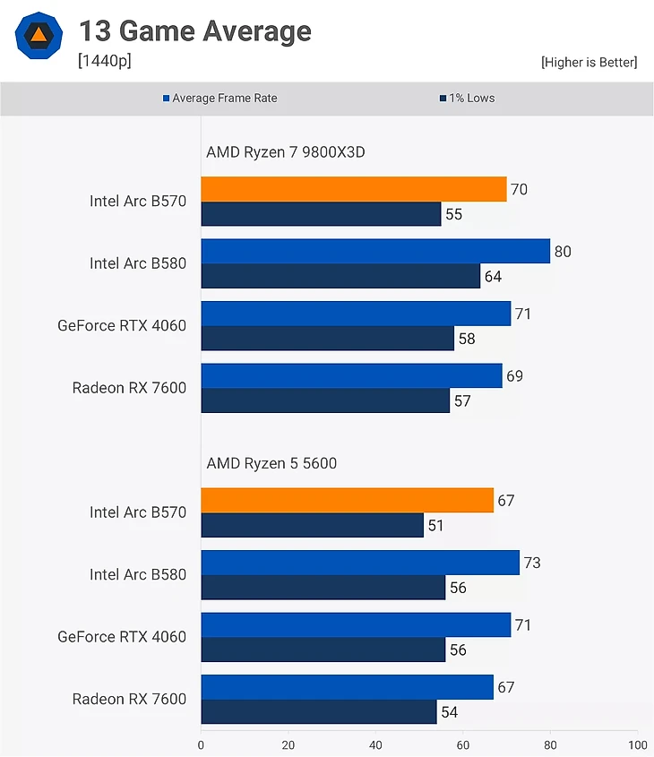 При разрешении 1440p результаты Intel Arc B570 заметно улучшаются. В среднем новинка от Intel оказалась примерно на 10% медленнее, чем GeForce RTX 4060.