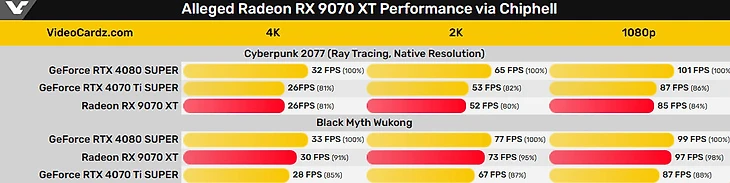 К следующей информации о видеокартах, которая так же была взята из chiphell, которая снова была удалена, в которой говорилось о производительности на 9070 XT. В том же Cyberpunk 2077 и Black Myth: Wukong результаты довольно неплохие
