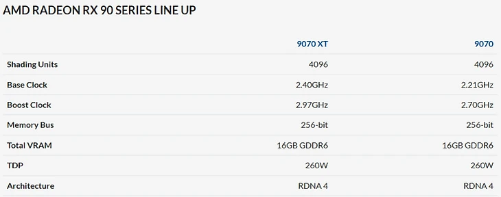 ложенная здесь в спецификациях, по-видимому, у 9070 XT будет 4096 шейдеров,но так же указанно что у 9070 тоже 4096 шейдеров, на самом деле я думаю это опечатка, должно быть 3584