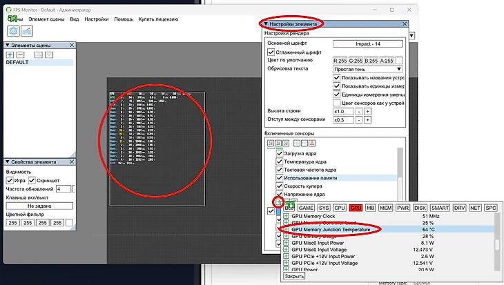 Важно отслеживать температуру видеопамяти, ведь она нагревается сильнее всего. Для этого можно воспользоваться программой FPS Monitor. После установки кликните на датчики, потом в «Настройках элемента» долистайте до GPU, нажмите на плюс и добавьте «GPU Memory Junction Temperature».