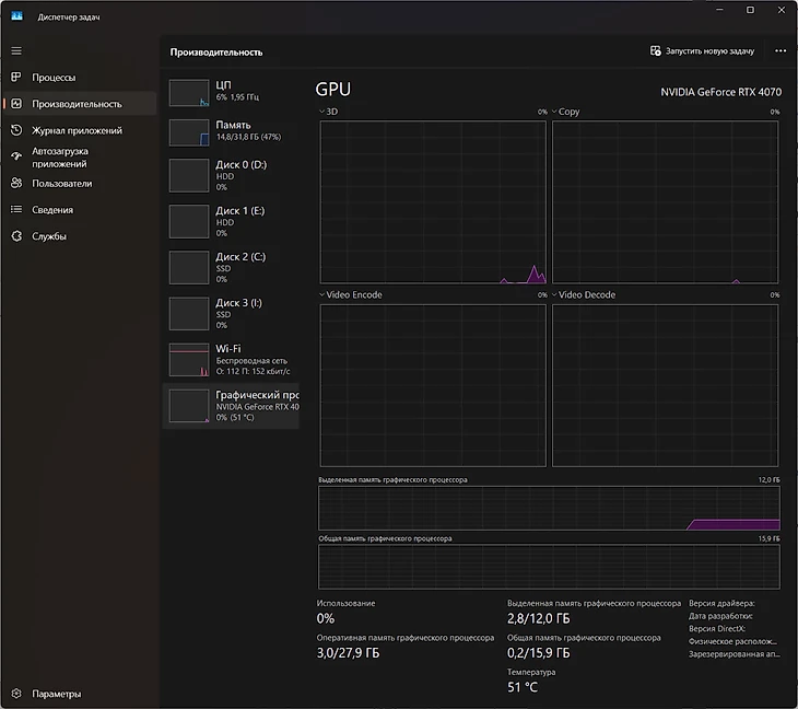 В Windows 10 и 11 можно проверить температуру через диспетчер задач. Нажмите Ctrl+Alt+Delete, Ctrl+Shift+Esc или нажмите правой кнопкой мыши на панель задач. В появившемся диспетчере перейдите на вкладку «Производительность» – на Windows 10 она расположена вверху, на Windows 11 в колонке слева. В конце списка, в разделе «Графический процессор», написана температура в градусах.