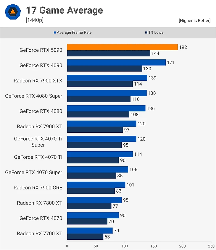 Даже при разрешении 1440p работоспособность RTX 5090 часто сильно ограничивается центральным процессором, что приводит к увеличению производительности всего на 12% по сравнению с RTX 4090 в 17 протестированных играх.