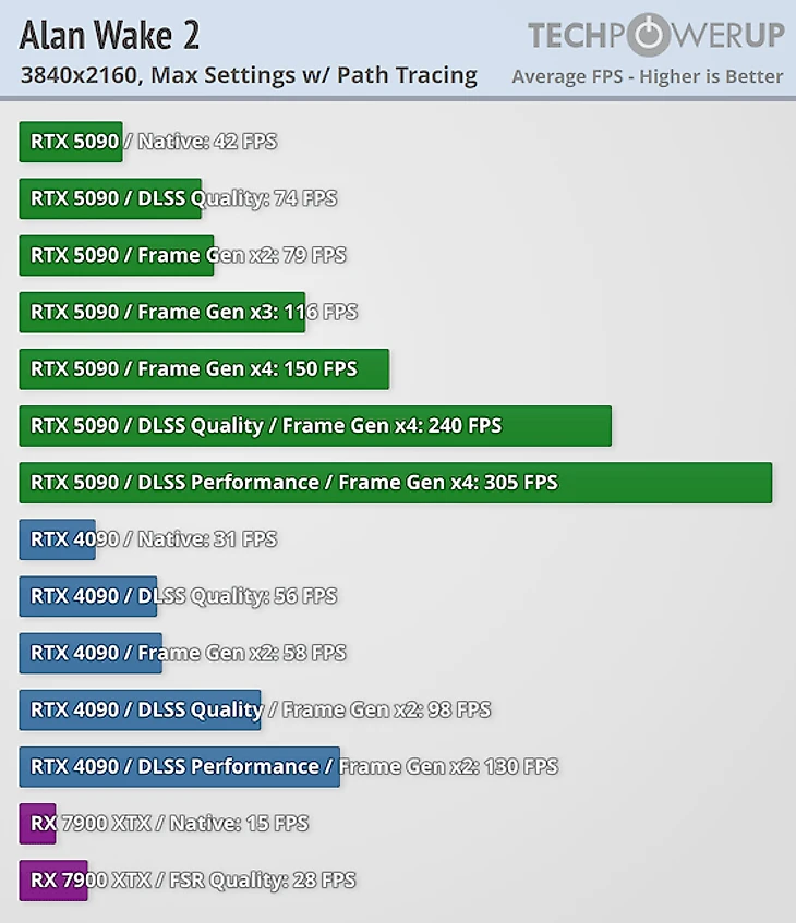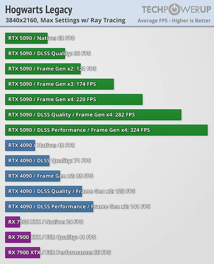Эксперты TechPowerUp отдельно провели тестирование RTX 5090 с использованием технологии DLSS 4 и многокадровой генерации – эксклюзивной фичи, доступной только на видеокартах серии RTX 50.