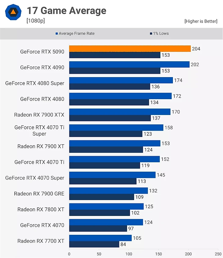 RTX 4090 и RTX 5090 сильно ограничены в производительности при таком разрешении, что делает их идеальными для тестирования процессора, а не видеокарты.