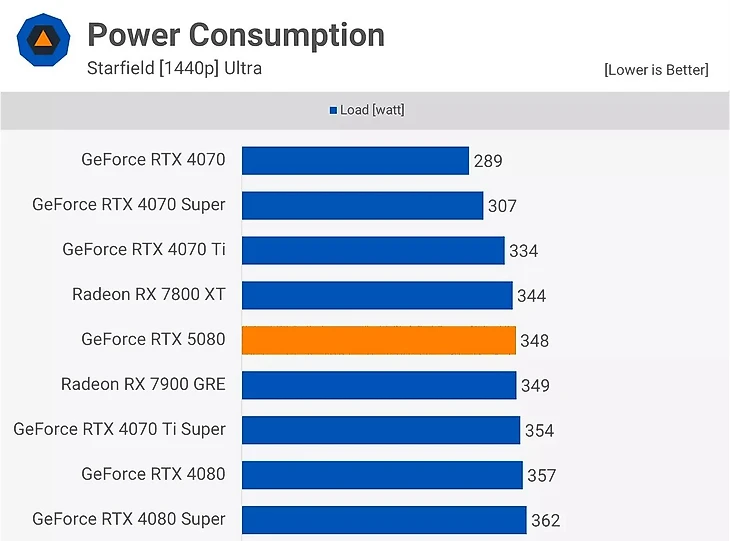 Тесты показали вполне приемлемые результаты, по крайней мере, при разрешении 1440p. Видеокарта потребляет на 4–19% меньше энергии по сравнению с RTX 4080 Super и Radeon RX 7900 XTX.