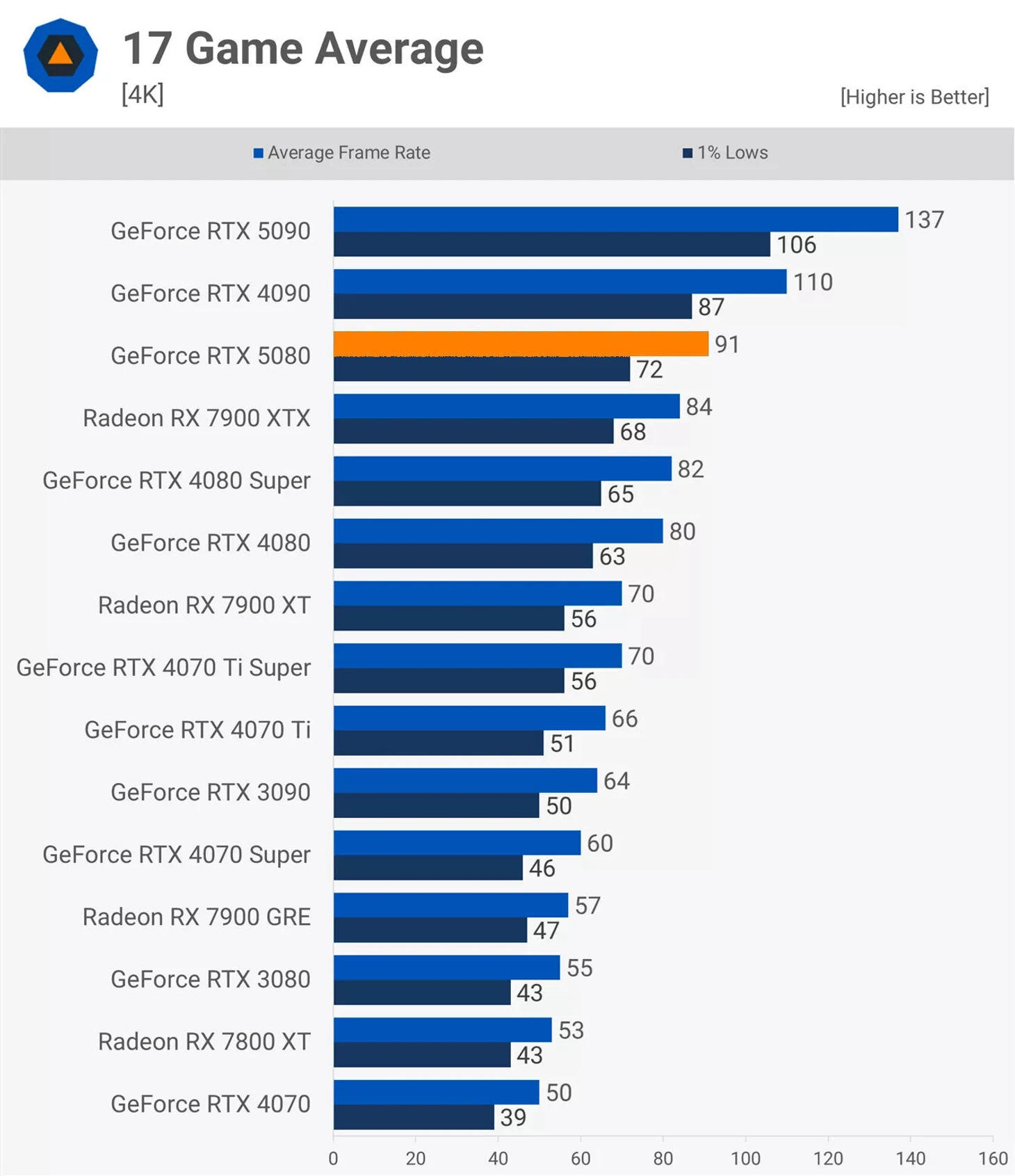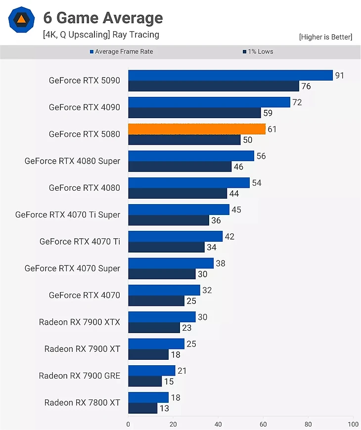 При разрешении 4K результаты не сильно лучше. Конечно, RTX 5080 в среднем на 11% быстрее, но это все равно довольно слабо для видеокарты нового поколения.