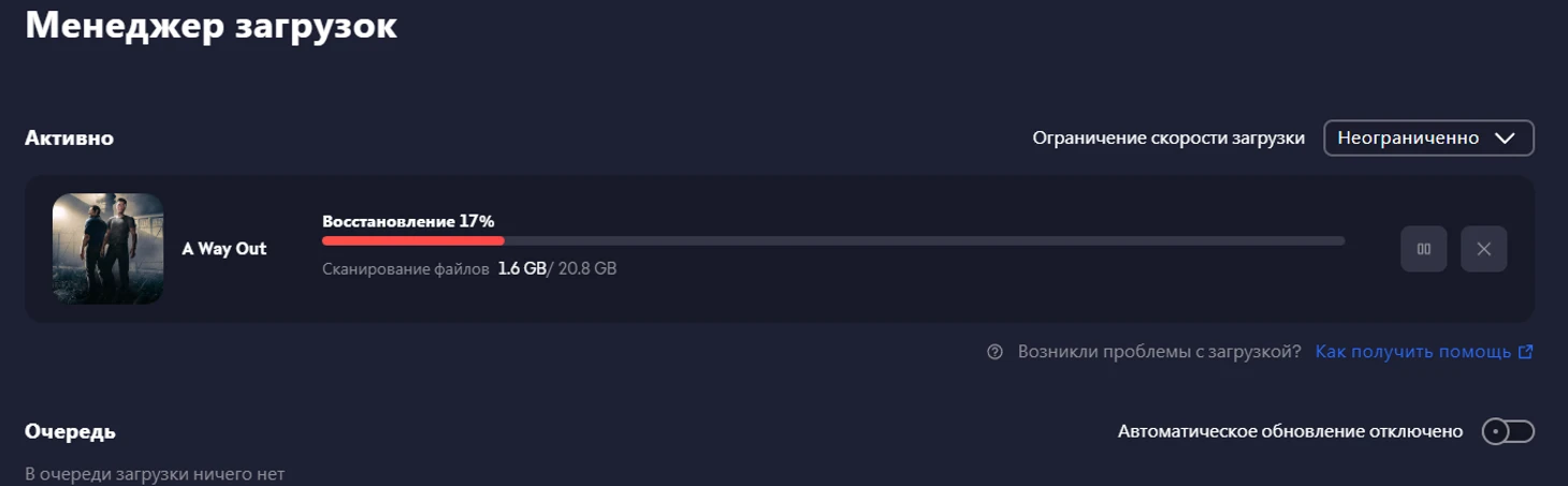 • Перейдите на страницу нужной игры, кликнув по ее карточке. В выпадающем списке настроек выбираем «Восстановить», после чего приложение проверит кэш файлов. В зависимости от размера игры процесс займет от нескольких минут до часа.