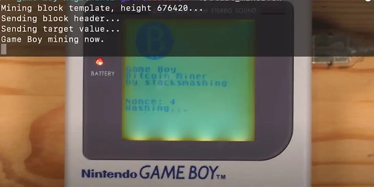 Другой парень, ютубер stacksmashing, додумался майнить с помощью популярной в прошлом консоли Nintendo Game Boy 1989 года. Он подключил приставку к интернету через микроконтроллер Raspberry Pi Pico и запустил программу для добычи биткойна.