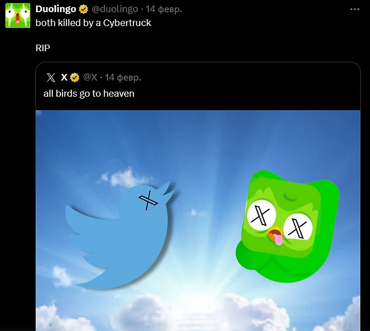 24 февраля Duolingo опубликовал в соцсетях видео, где «сова Дуо» воскресает из мертвых, выбравшись из гроба. Судя по всему, кибертрак ее не победил.