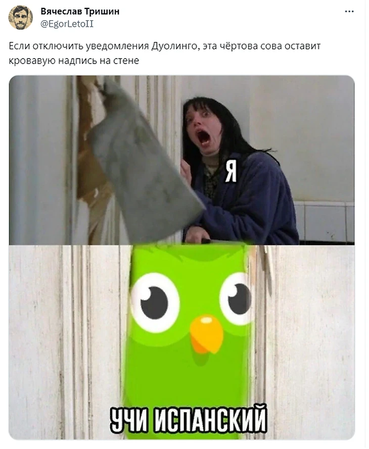 Пассивно-агрессивные уведомления Duolingo стали поводом для многочисленных мемов. Сова преследует, донимает, угрожает пользователям и вообще делает все, чтобы заставить пройти урок.
