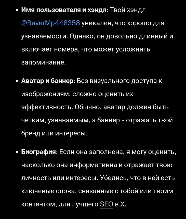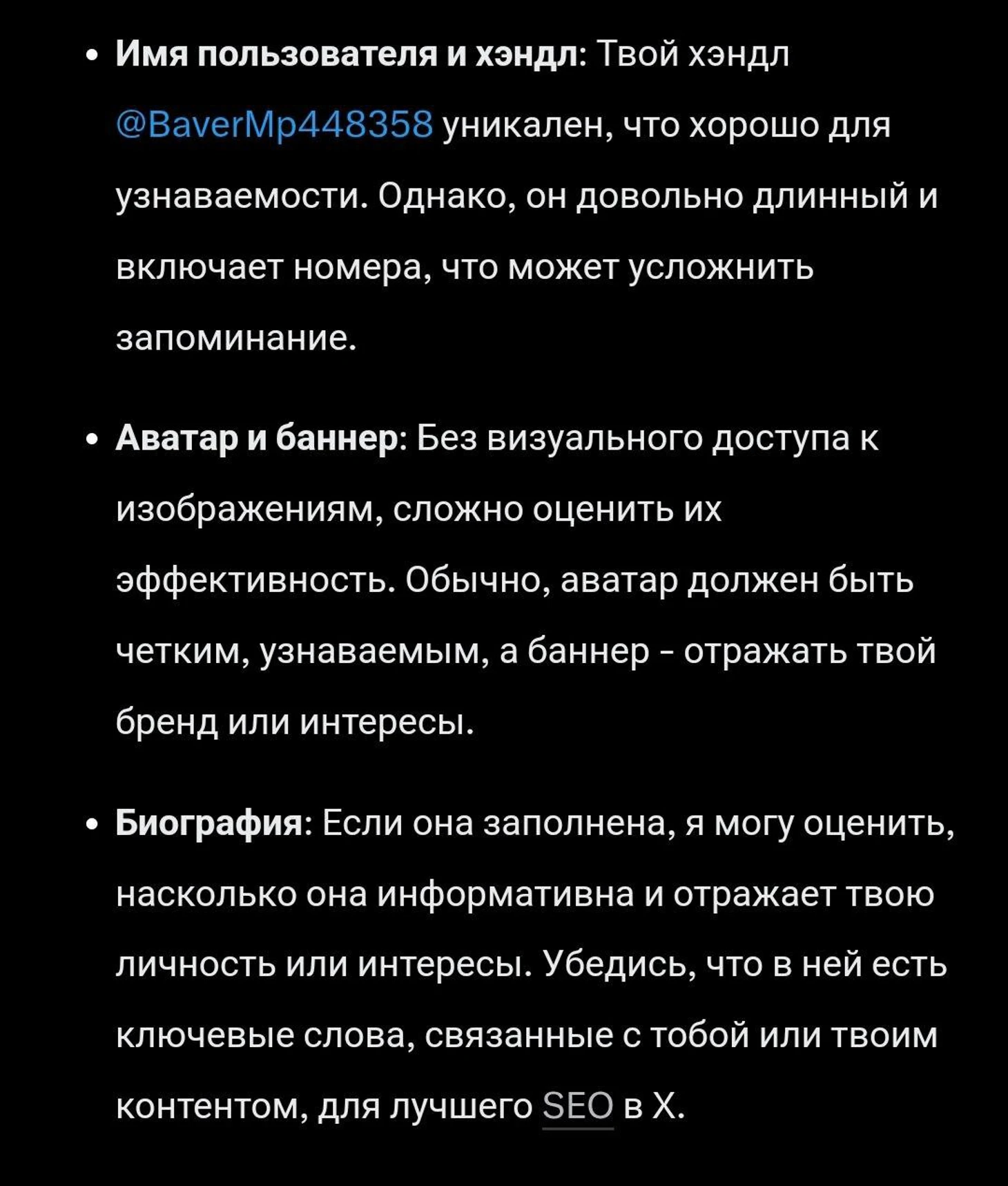 Для этого текста я попросил Grok оценить мой профиль – он отметил, что у меня отсутствует аватар и описание