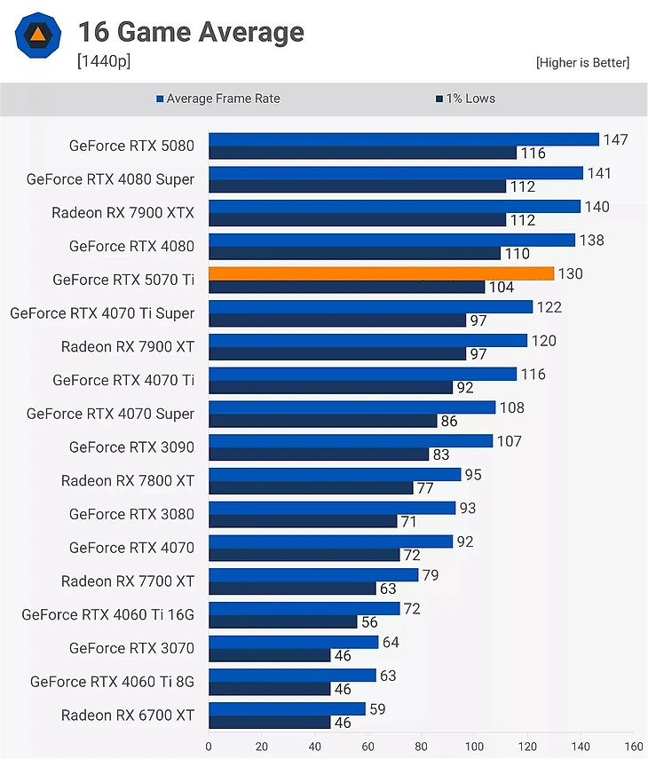 Прирост производительности в разрешении 1440p тоже весьма скромный. Новинка всего на 7% быстрее RTX 4070 Ti Super и на 8% быстрее Radeon RX 7900 XT. Отставание от RTX 5080 составляет 12%.