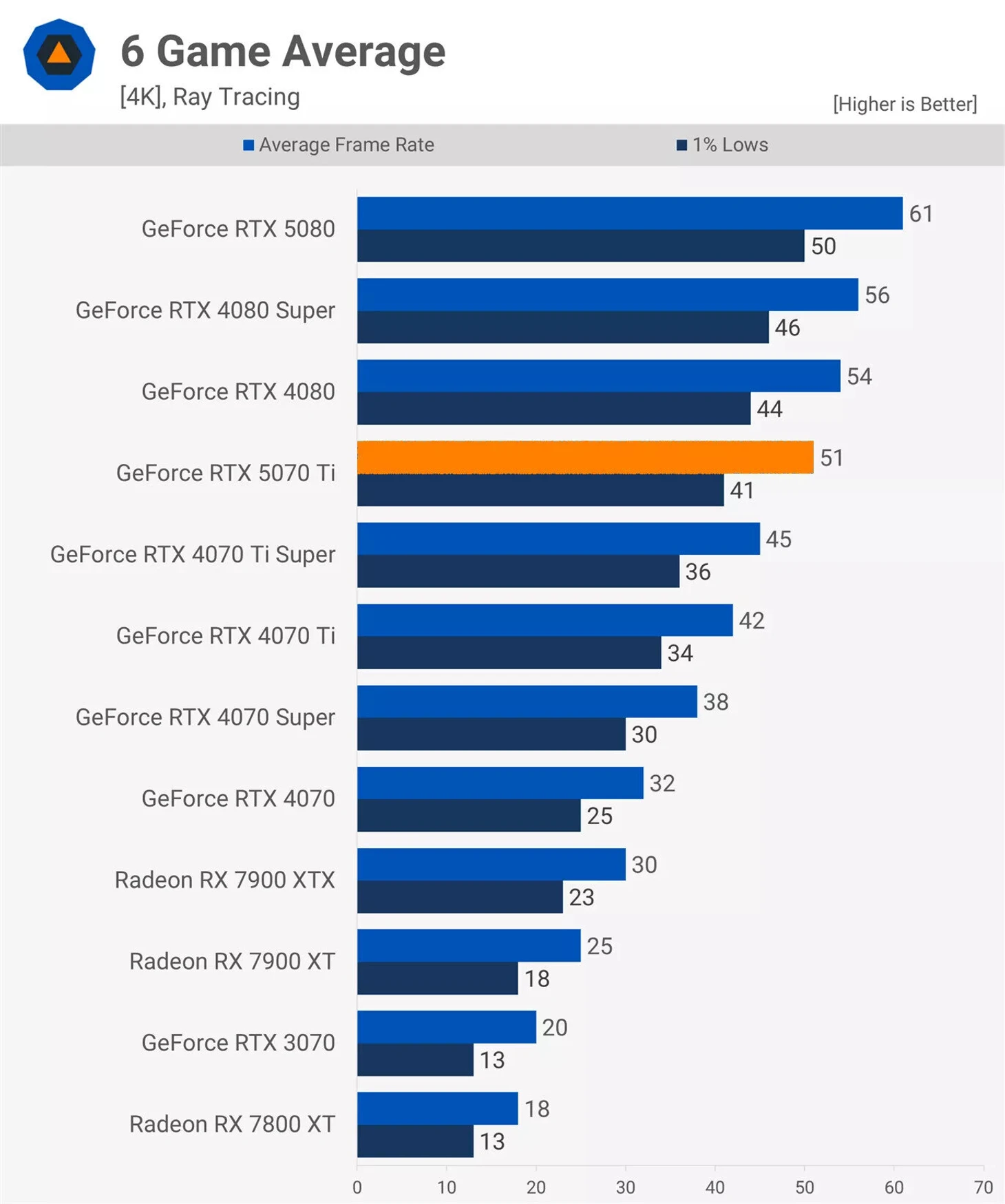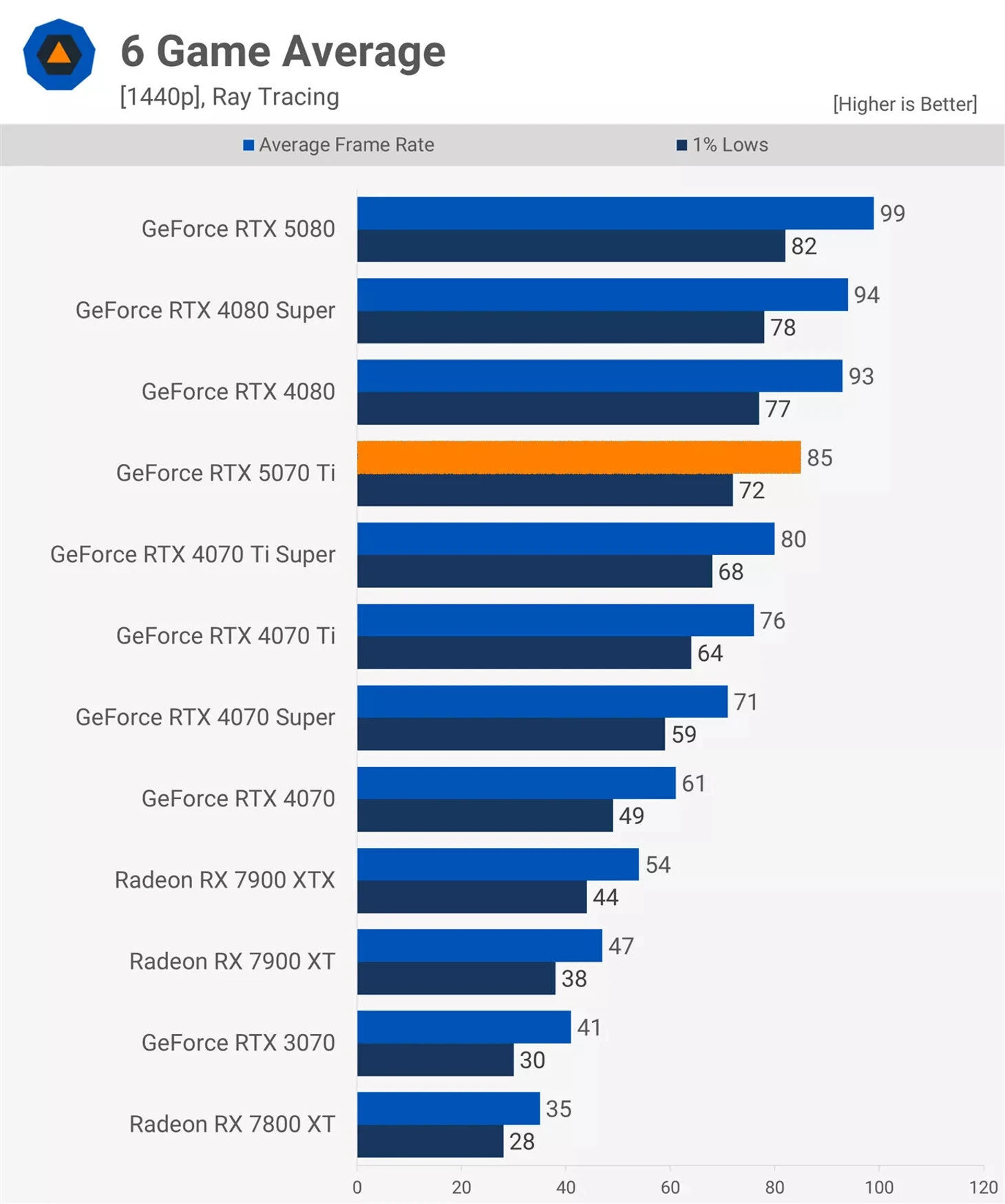 Эксперты TechSpot остались разочарованы результатами тестов трассировки лучей. При разрешении 1440p видеокарта RTX 5070 Ti оказалась в среднем на 6% быстрее RTX 4070 Ti Super. При этом новинка уступила RTX 4080 на 9%.