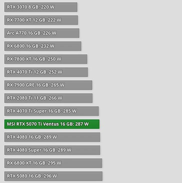 Эксперты TechPowerUp отметили, что RTX 5070 Ti потребляет примерно столько же энергии, сколько RTX 4080 и 4070 Ti Super. Система охлаждения от MSI им, к слову, не понравилась – очень громкая.
