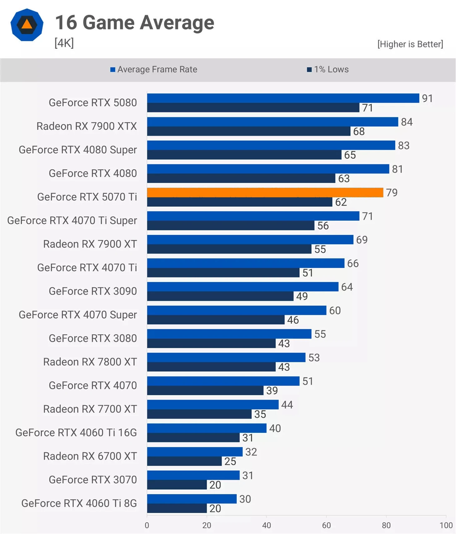 Тесты портала TechSpot показали, что GeForce RTX 5070 Ti в среднем на 7% быстрее RTX 4070 Ti и всего на 3,1 % мощнее RTX 4070 Ti Super. При этом новинка уступила Radeon RX 7900 XTX и обеим моделям RTX 4080.