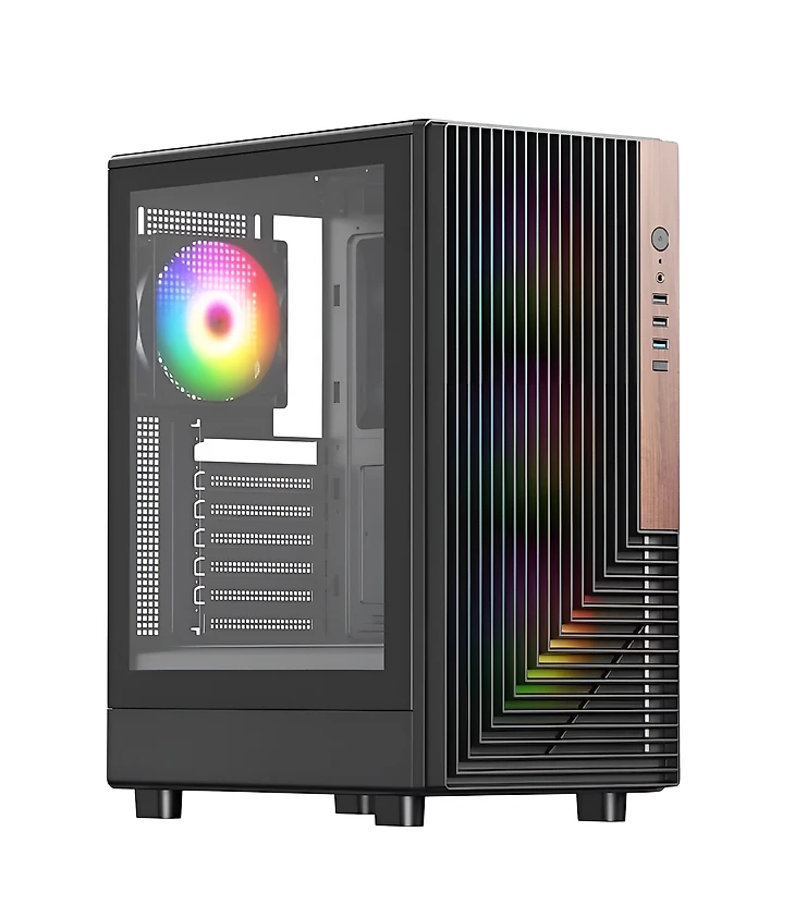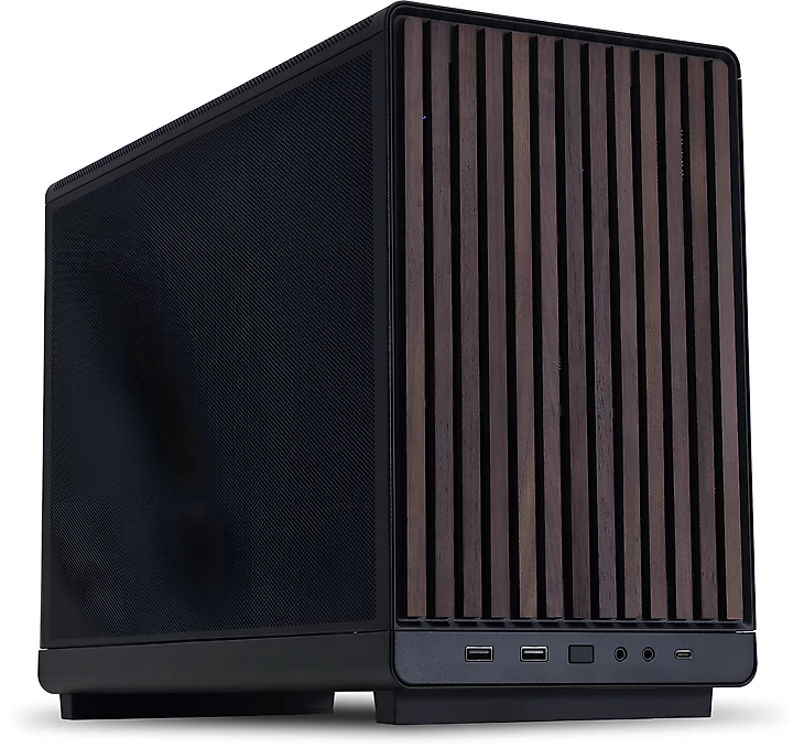 Внешний вид – очень стильная вставка из темного дерева на передней панели, на ней же расположены разъемы: один USB Type C, два 3,5 мм jack и два USB 3.0. Все стенки корпуса выполнены в виде решетки для улучшения продуваемости. А еще через них будет видно ваши красивые комплектующие.