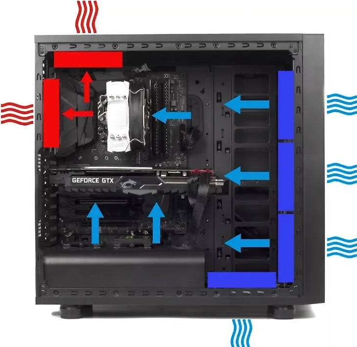 Продуваемость способствует эффективному охлаждению. Как это работает: воздушный поток втягивается в корпус с одной стороны, нагревается внутри и выходит с другой.