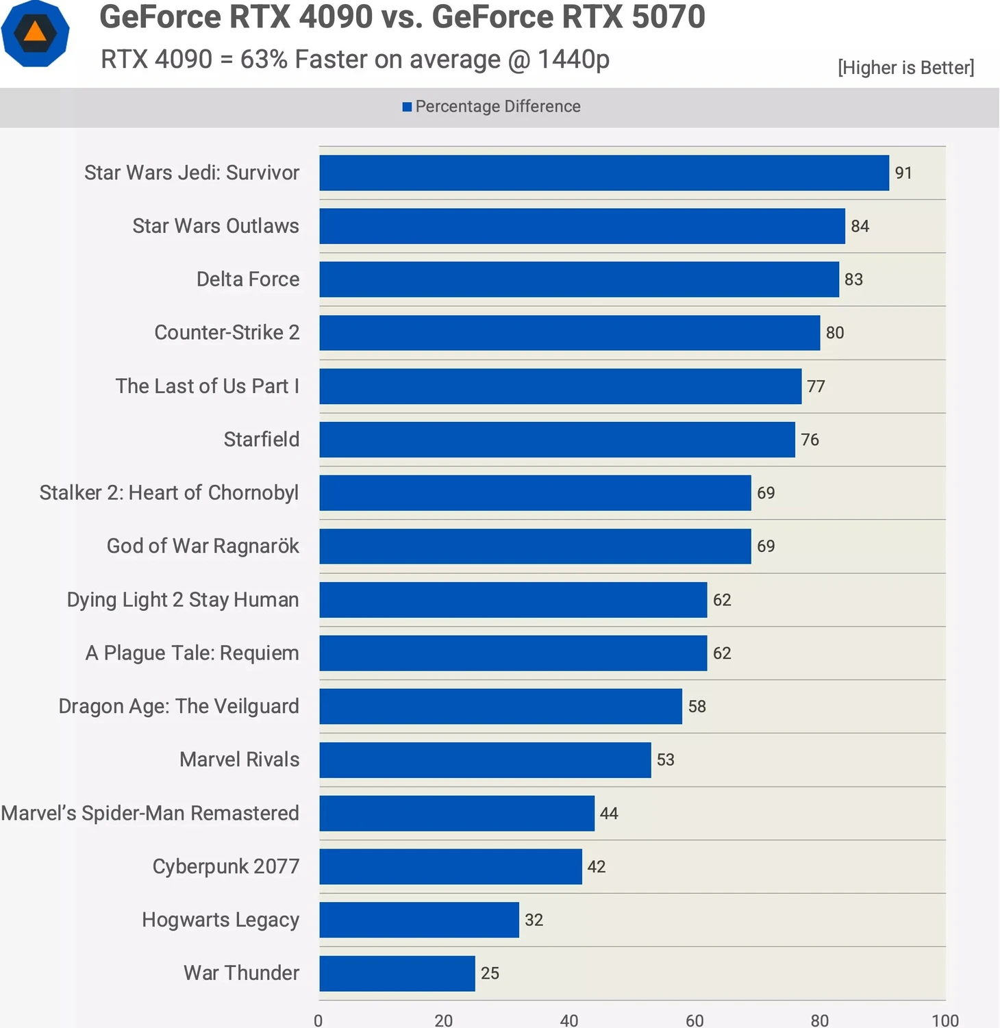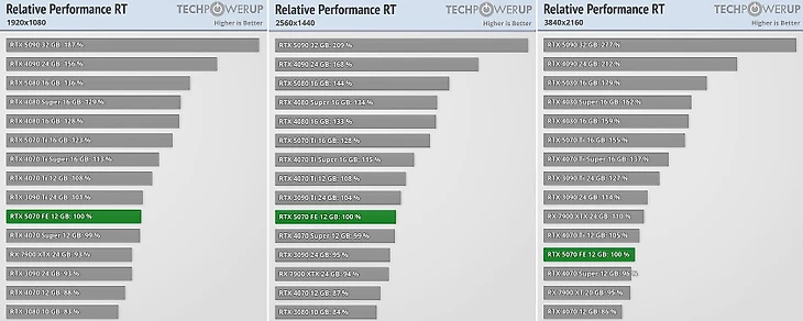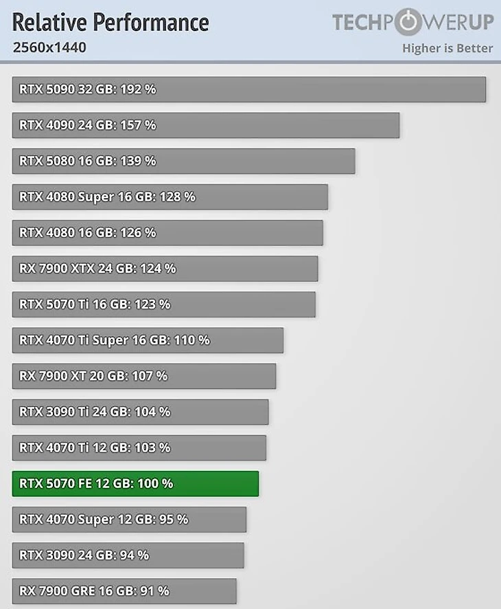 RTX 5070 оказалась на 5% быстрее RTX 4070 Super. При этом она на 3% медленнее RTX 4070 Ti и на 23% уступает RTX 5070 Ti.