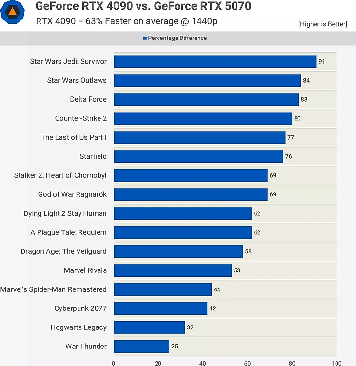 В тестированиях издания TechPowerUp, RTX 5070 опередила RTX 4070 Super на 4% при разрешении 1080p и обычную RTX 4070 – на 16%. При этом видеокарта уступила 4070 Ti на 4%.