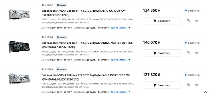 Стоимость RTX 5070 начинается от 100 тысяч рублей за некоторые модели от MSI. На момент написания текста на российских площадках цены на видеокарту достигают 140 тысяч рублей, вплотную приближаясь к стоимости RTX 5070 Ti.