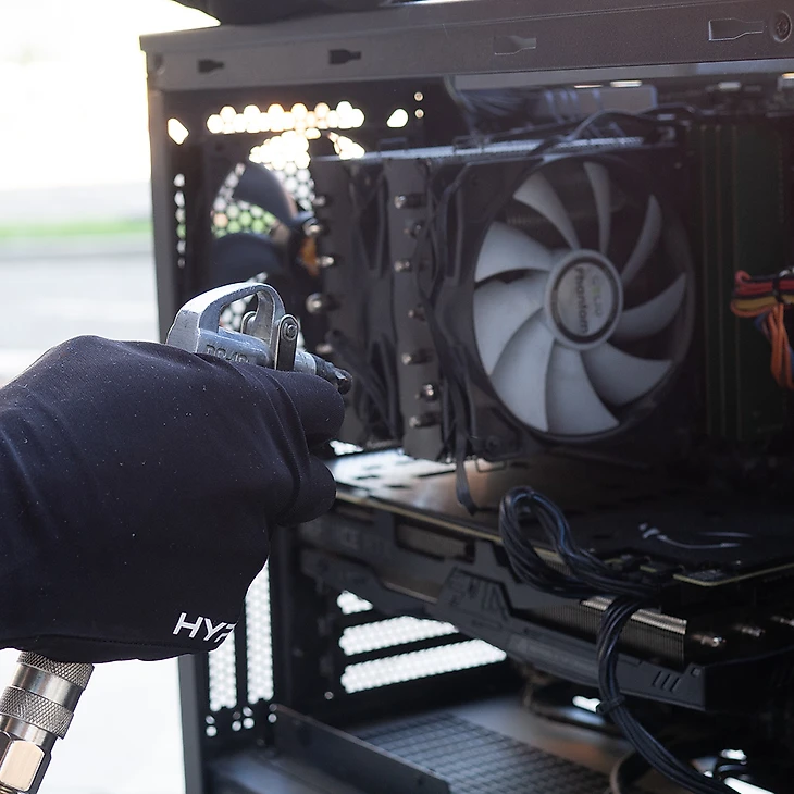 Используя сжатый воздух, продуйте вентиляторы и ребра радиатора. Держите баллончик на расстоянии 10-15 см (желательно делать это в помещении, которое будет просто убрать, ведь пыль разлетится по всей комнате);