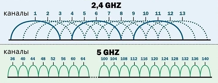 Устройства 2,4 ГГц шире по покрытию, но медленнее (до 300-600 Мбит/с) и чувствительны к помехам от соседних сетей;