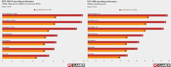 Апскейлеры и мультигенерация кадров буквально спасают положение на всех видеокартах. Благодаря DLSS 4 и генератору кадров FSR RTX 3060 Ti демонстрирует комфортные 79 FPS на высоких настройках с включенным RT-освещением. А ноутбучная RTX 4050 – до 98 FPS на среднем пресете графики.