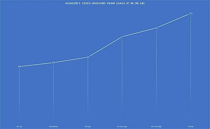Однако использование VRAM снижается до 10 ГБ при «сверхвысоком» пресете, 9 ГБ при «очень высоком», 7 ГБ при «высоком» и 6,4 ГБ при «среднем» качестве графики.