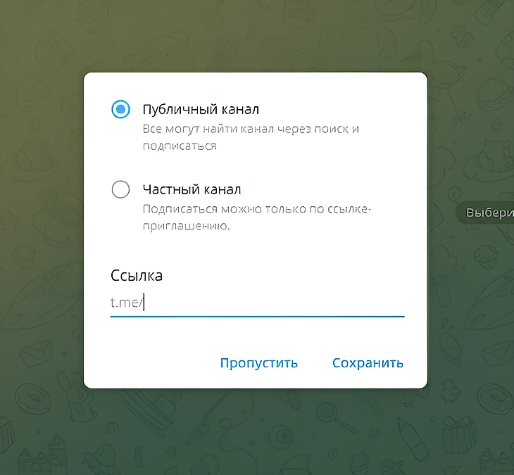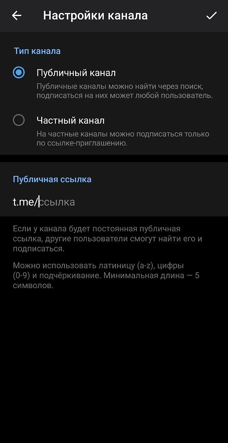 Выберите тип канала: публичный или частный. Для публичного можно придумать красивую ссылку, для частного она создастся автоматически.