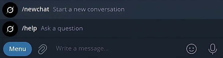 Затем по кнопке меню можно будет пересоздать чат или вывести сообщение с ответами на частые вопросы.
