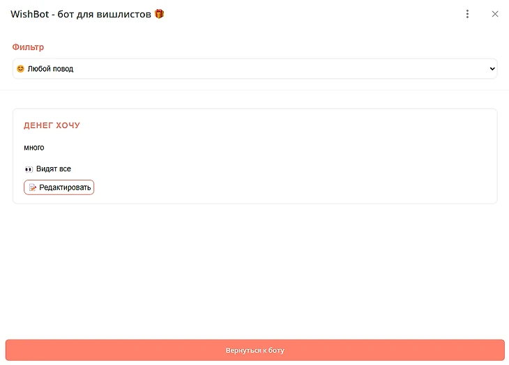 Помогает организовать список желаний – особенно удобно для праздников или спонтанных подарков. Добавляйте в бот ссылки, фото или описания вещей, которые вам нравятся, а потом делитесь списком с друзьями. Бот автоматически закрепляет за каждым участником выбранный пункт, чтобы избежать ситуаций, когда несколько человек купили одно и то же.
