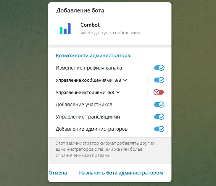 Выдача прав администратора Combot’у. После этого можно составлять список банвордов и настраивать остальное.