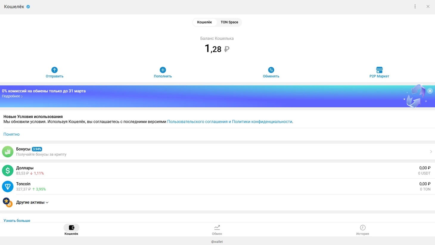 Официальный бот от разработчиков телеграма для работы с криптовалютами в экосистеме TON.