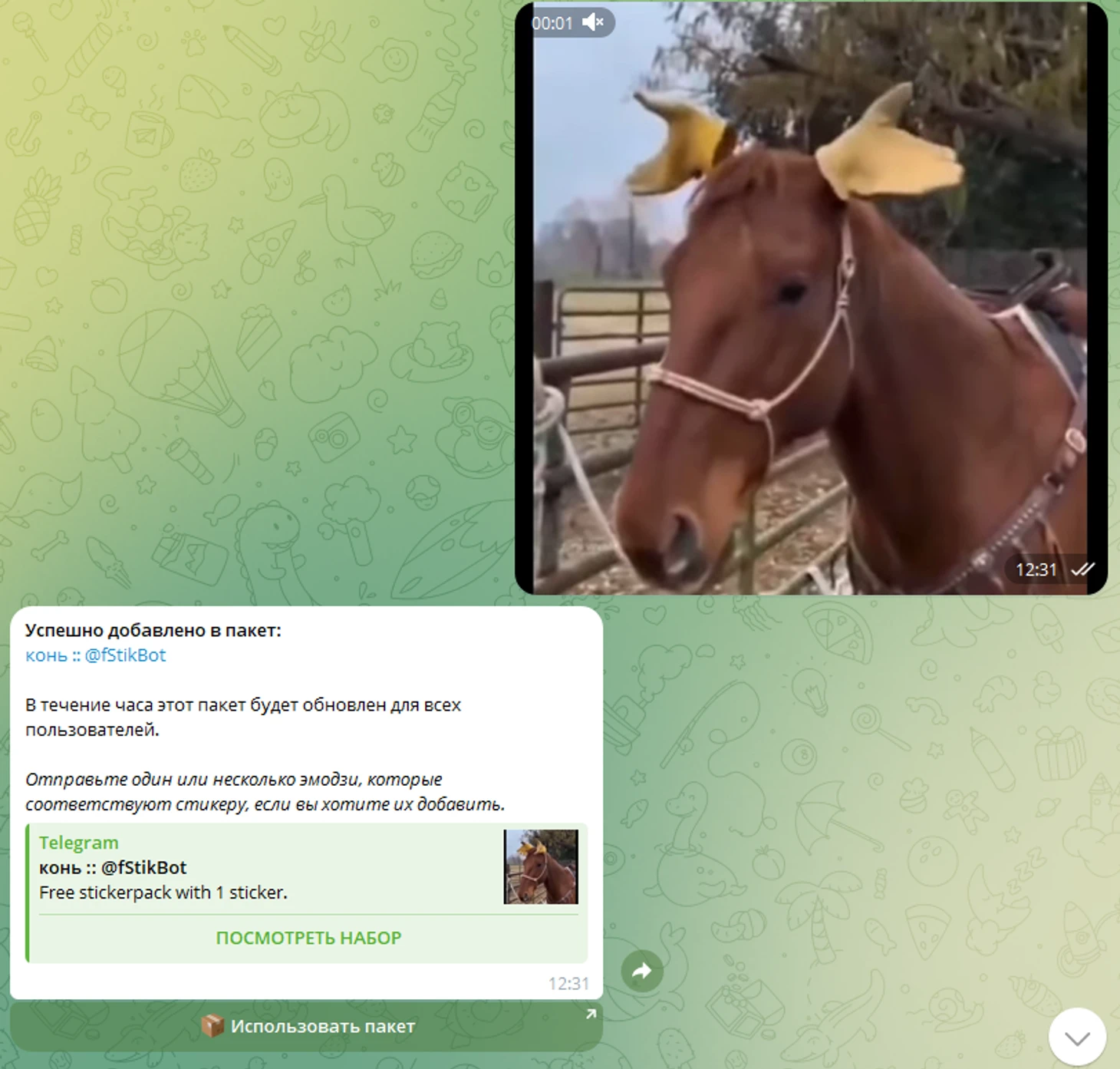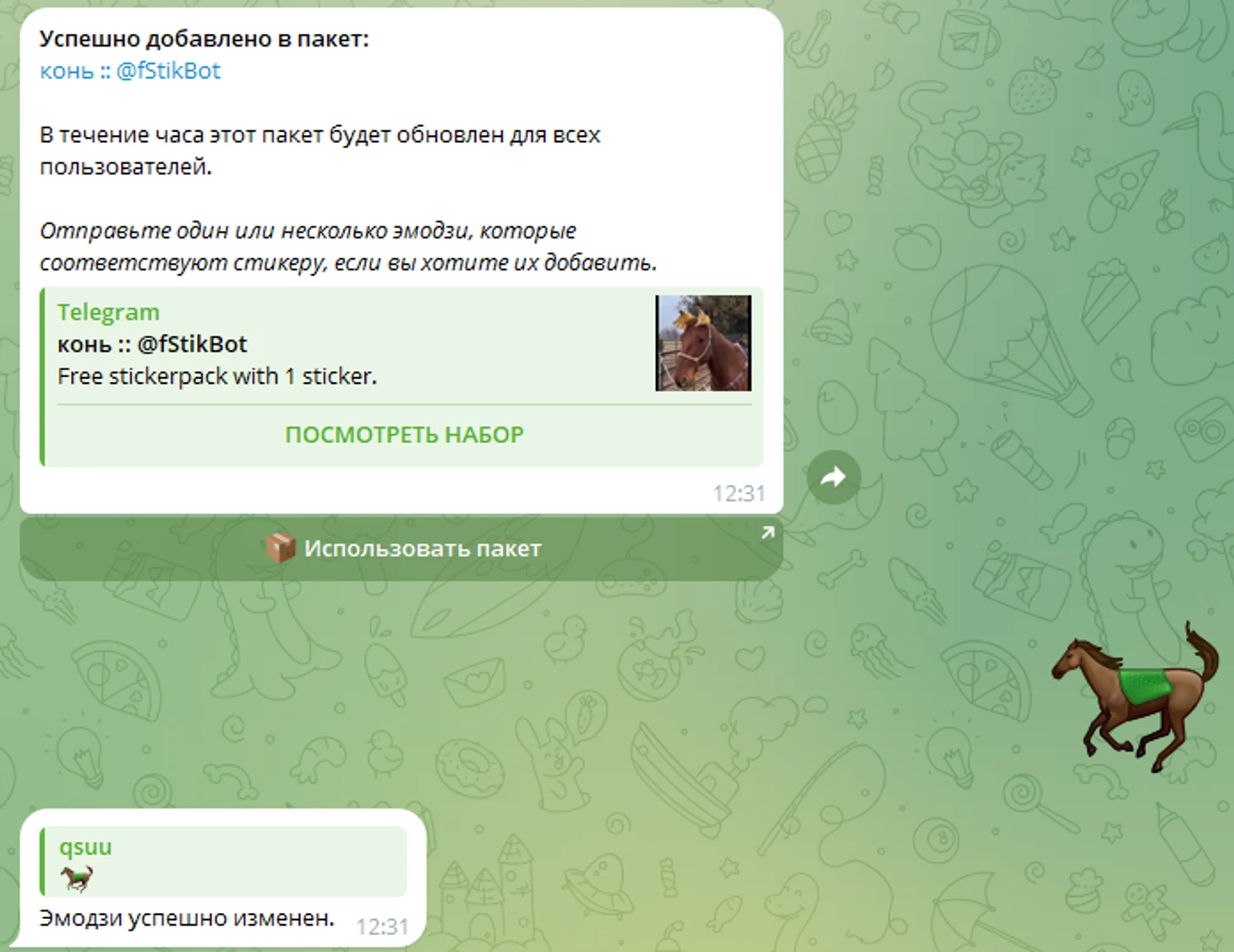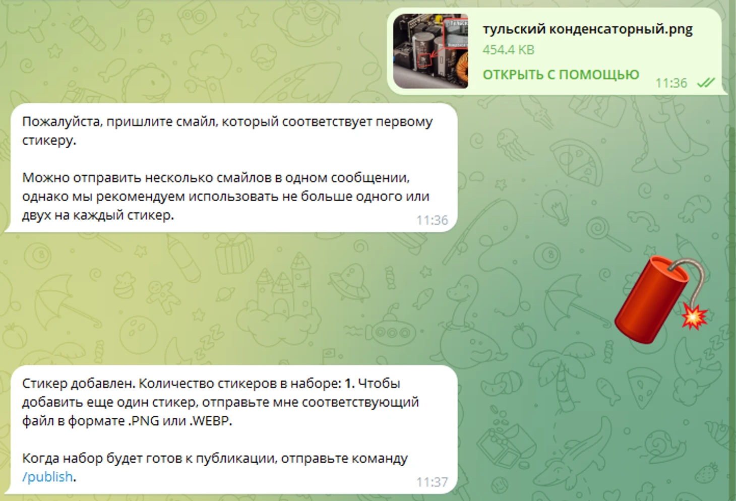 После этого отправляйте боту видео или файл .gif – он автоматически конвертирует его в нужный формат и добавит в стикерпак. Это его главное преимущество перед Stickers Bot, у которого часто возникают проблемы с видеофайлами: не тот формат, неподходящий размер видео, неправильный кодек.